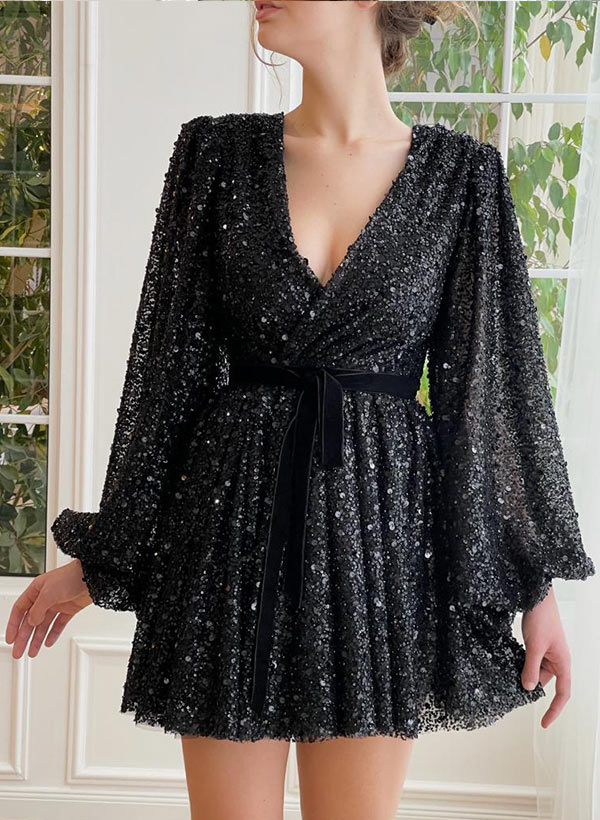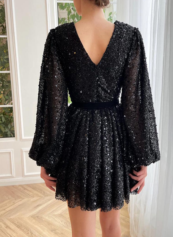 A-Line V-Neck Long Sleeves Short/Mini Sequined Homecoming Dresses