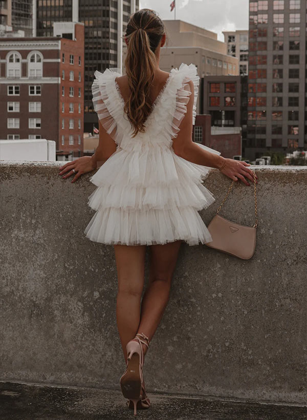 A-Line V-Neck Sleeveless Short/Mini Tulle Homecoming Dresses