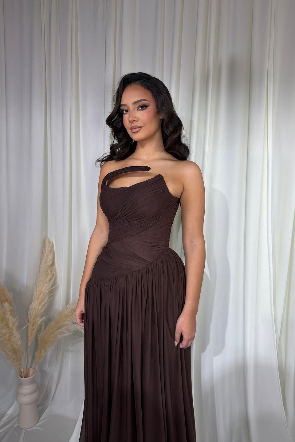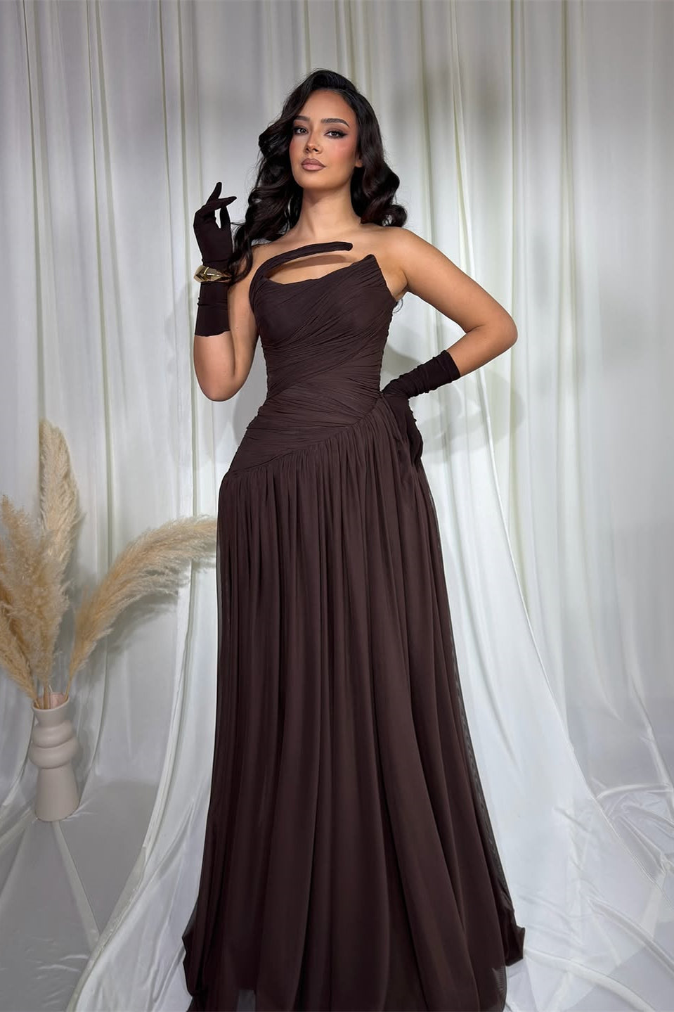 Elevate your prom night with this sophisticated chocolate chiffon gown. The strapless neckline and sleeveless silhouette create an elegant, timeless look, while the flowing A-line skirt with delicate pleats offers graceful movement and flattering proportions. Crafted from luxurious chiffon fabric, this dress drapes beautifully and ensures comfort throughout the evening. Perfect for making a refined statement at any formal occasion, this piece combines classic design with contemporary elegance for an unforgettable appearance.