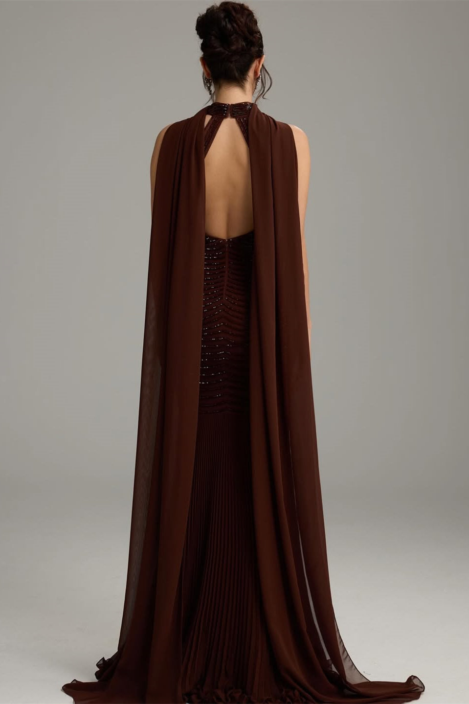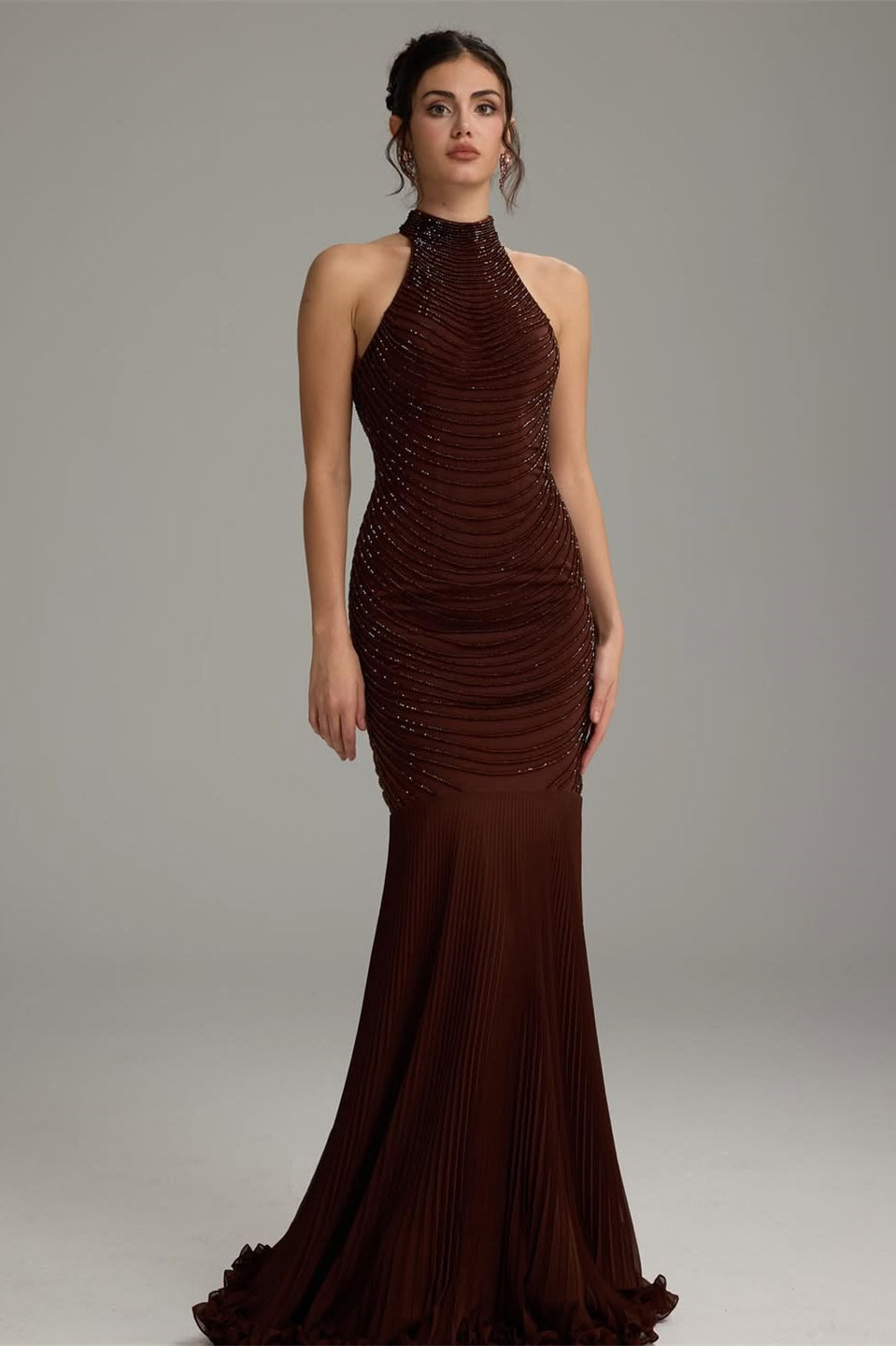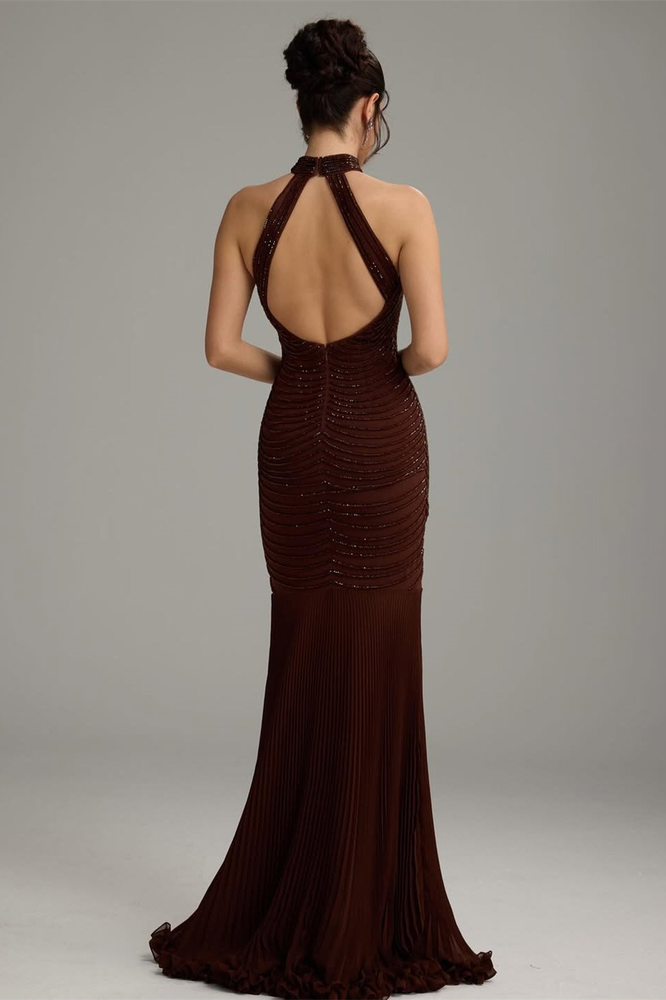 Captivate in this sophisticated dark brown mermaid prom dress, designed to turn heads with its elegant halter neckline and daring backless silhouette. The sleek sheath construction hugs your curves beautifully, while intricate beading adorns the bodice and cascades down the gown, catching light with every movement. Perfect for those seeking a bold, glamorous statement at prom or formal events, this dress combines timeless elegance with modern allure. The flowing mermaid skirt creates a dramatic entrance, ensuring you'll feel confident and radiant all evening long.