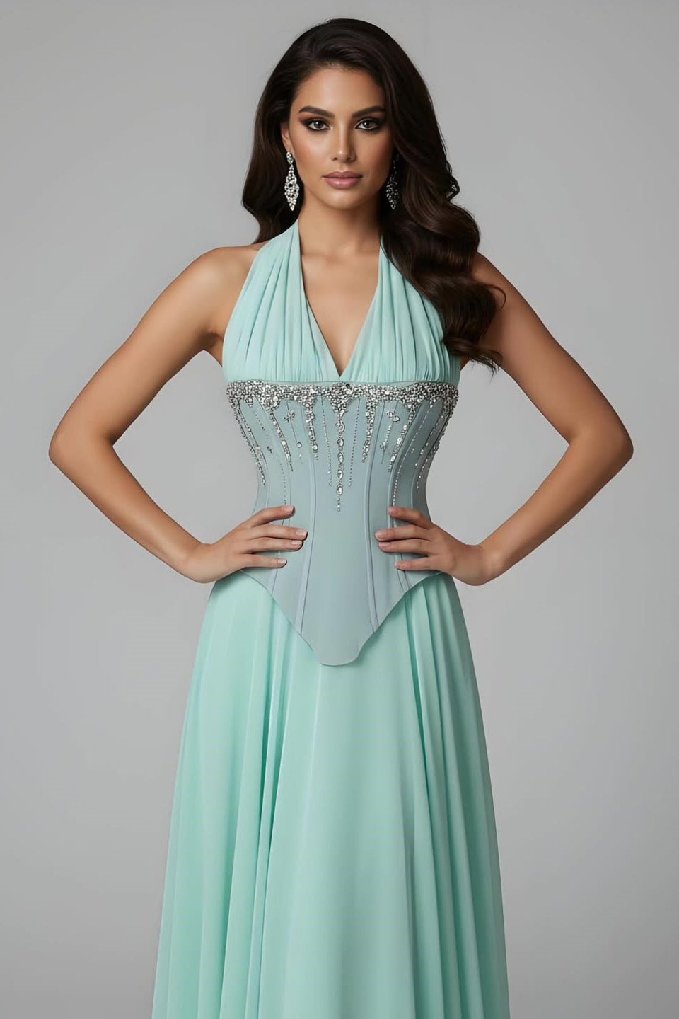 Charming Mint Halter Sleeveless Chiffon Prom Dresses A-Line Gem With Pleats