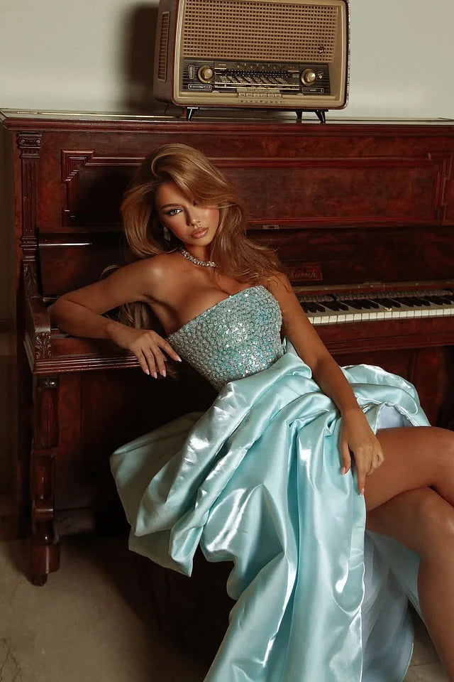Elevate your prom night with this stunning strapless satin gown. The sleek A-line silhouette flatters every figure, while delicate pleating adds refined texture and movement. Crafted from luxurious satin fabric, this floor-length dress exudes timeless elegance and sophistication. The strapless neckline creates a graceful, elongated look perfect for showcasing statement jewelry. An ideal choice for those seeking a classic yet captivating ensemble that commands attention and celebrates your most memorable evening.