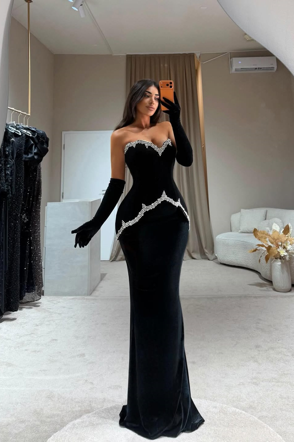 Make a stunning entrance in this sophisticated black prom dress that combines timeless elegance with modern glamour. The sweetheart neckline and strapless design create a flattering silhouette, while luxurious velvet fabric drapes beautifully into a graceful mermaid cut. Adorned with sparkling gem embellishments and paired with coordinating gloves, this dress exudes refined luxury perfect for your most memorable evening. An unforgettable choice for prom, galas, or formal celebrations.