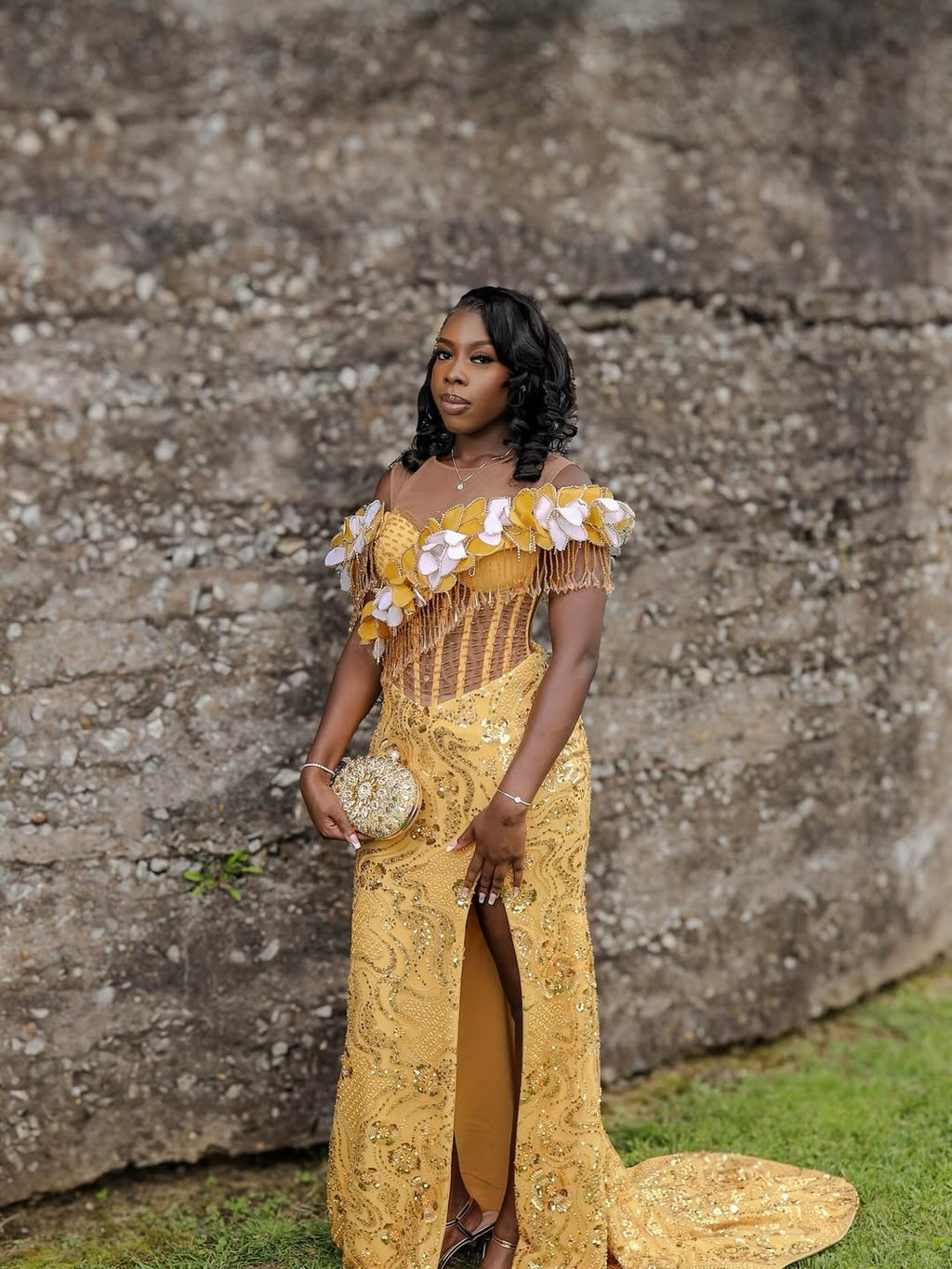 Captivate in radiant elegance with this striking yellow mermaid prom dress. The off-the-shoulder neckline and delicate short sleeves frame the shoulders with refined grace, while intricate beading adorns the bodice for a touch of couture sophistication. The form-fitting mermaid silhouette flows seamlessly to a dramatic high split, creating movement and allure with every step. Perfect for those seeking a bold yet polished statement at prom or formal events.