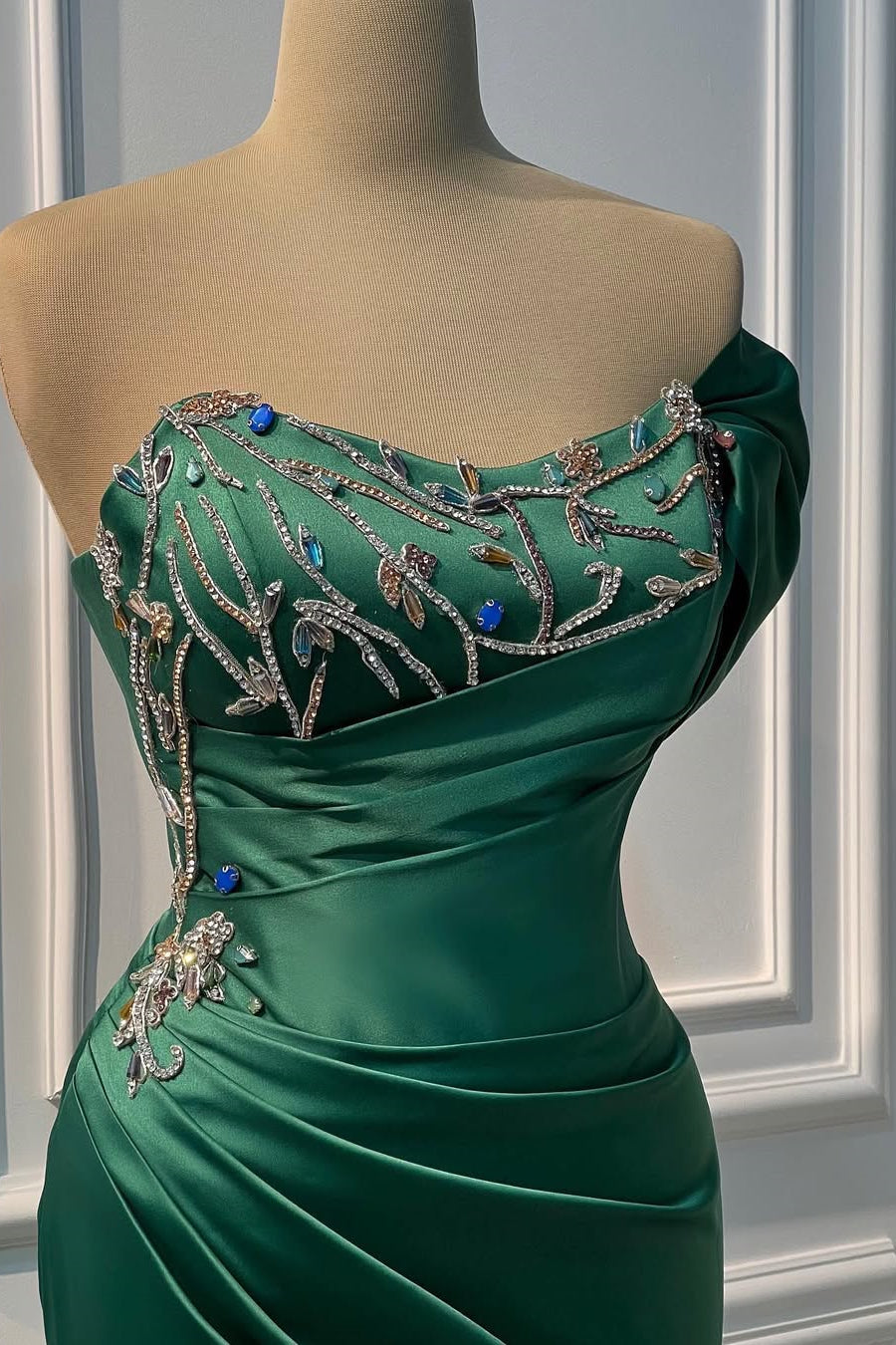 Make a stunning entrance in this glamorous dark green prom dress, designed to captivate. The elegant one-shoulder silhouette creates a refined, asymmetrical neckline that flatters any frame. Crafted from luxurious satin, the mermaid sheath cut hugs your curves beautifully before flowing into a dramatic hem. Intricate gem embellishments add sophisticated sparkle and dimension throughout, catching light with every movement. Perfect for prom, formal galas, or black-tie events, this dress combines timeless elegance with modern allure for an unforgettable night.
