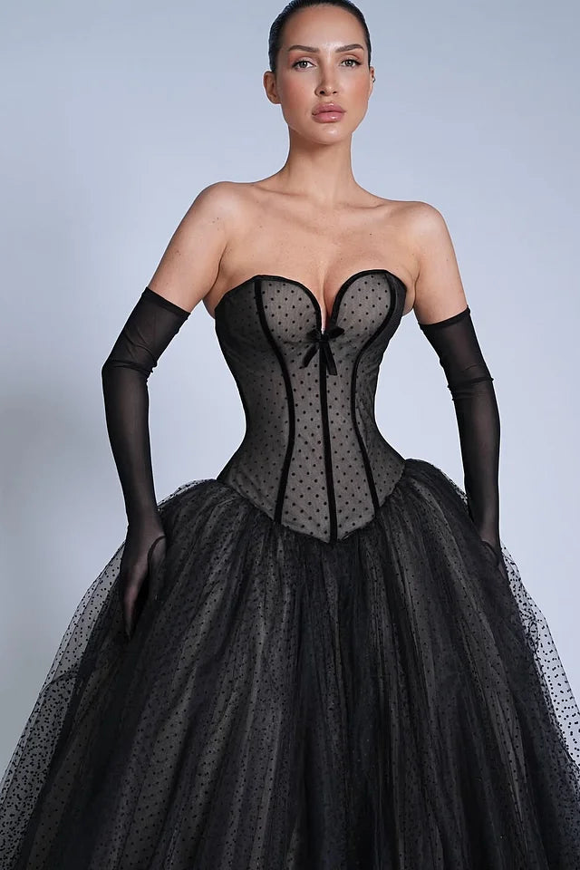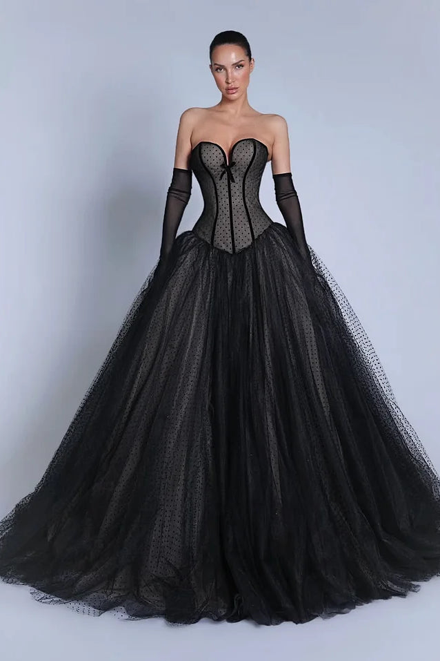 Make a stunning entrance in this luxurious black prom dress, designed for the discerning guest. The sweetheart neckline and strapless silhouette create an elegant, timeless look, while the voluminous A-line tulle skirt offers graceful movement and dimension. Delicate pleats add refined texture throughout, and the dramatic lace-up back detail provides both visual interest and a custom fit. Paired with coordinating gloves for an extra touch of sophistication, this gown captures classic glamour with modern flair. Perfect for prom, formal galas, or any black-tie occasion where you want to command attention with understated elegance.