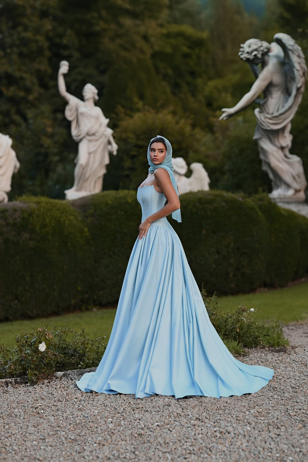 Embrace understated elegance with this sky blue satin prom dress. The strapless neckline and sleeveless silhouette create a refined, modern aesthetic, while the A-line skirt flows gracefully with subtle pleating for added dimension. Crafted from luxurious satin, this floor-length gown delivers timeless sophistication perfect for formal occasions. The minimalist design lets the fabric's lustrous finish and flattering silhouette take center stage, making it an ideal choice for those who prefer quiet luxury over ornate embellishment.