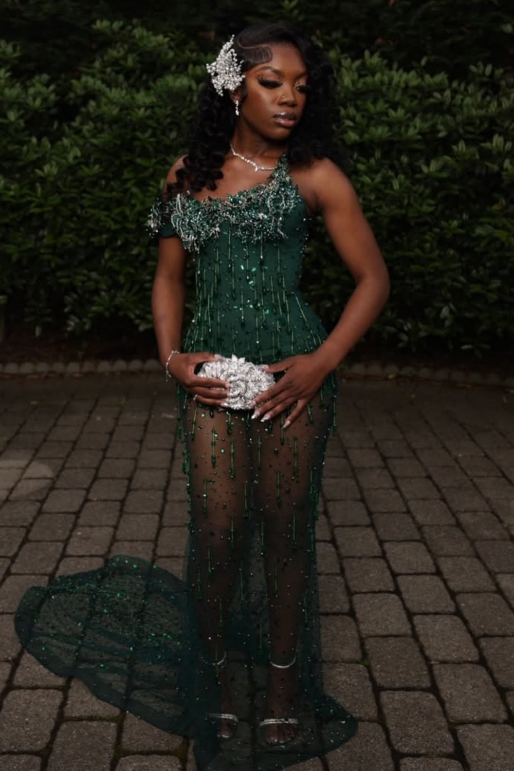 Make an unforgettable statement in this luxurious dark green mermaid gown. Intricate sparkle beads cascade across the bodice and silhouette, catching light with every movement for a mesmerizing effect. The fitted mermaid cut hugs your curves elegantly before flowing into a sweeping court train that commands attention. Rich jewel-tone sophistication combined with radiant embellishment creates an evening look of pure opulence—ideal for those who demand both refinement and radiance at formal events.