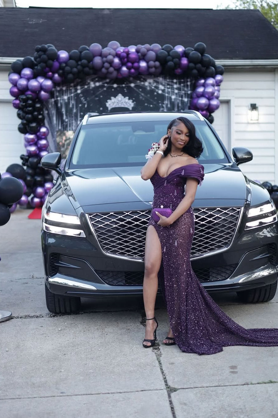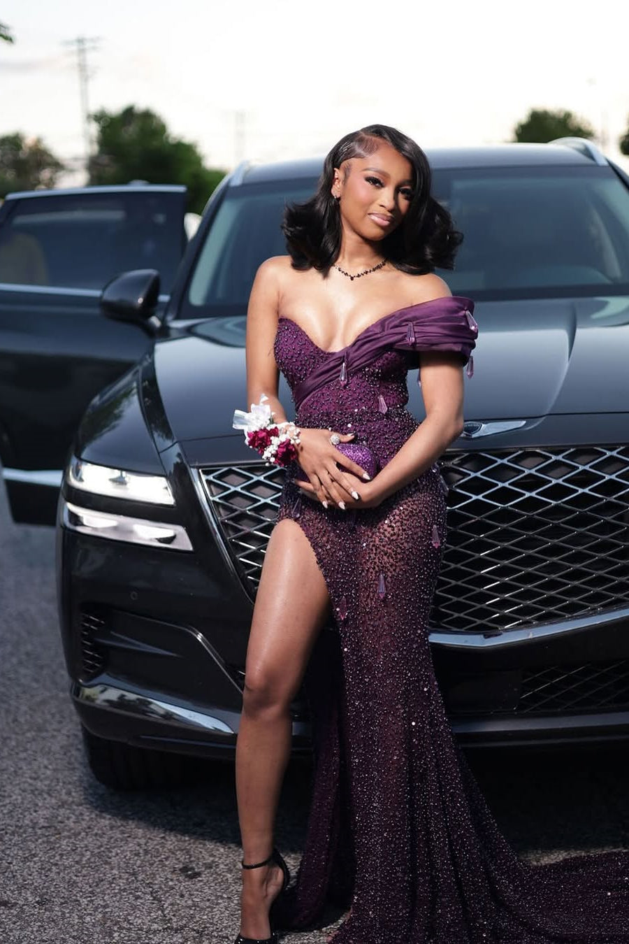 Captivate the room in this enchanting grape mermaid gown, designed for the modern romantic. The elegant one-shoulder V-neckline creates a graceful silhouette, while shimmering gem embellishments add refined glamour. A daring high split showcases movement and confidence with every step. Perfect for prom, galas, or formal celebrations, this dress combines timeless sophistication with contemporary allure. The flowing mermaid cut hugs your curves before cascading dramatically to the floor, ensuring you make an unforgettable entrance.