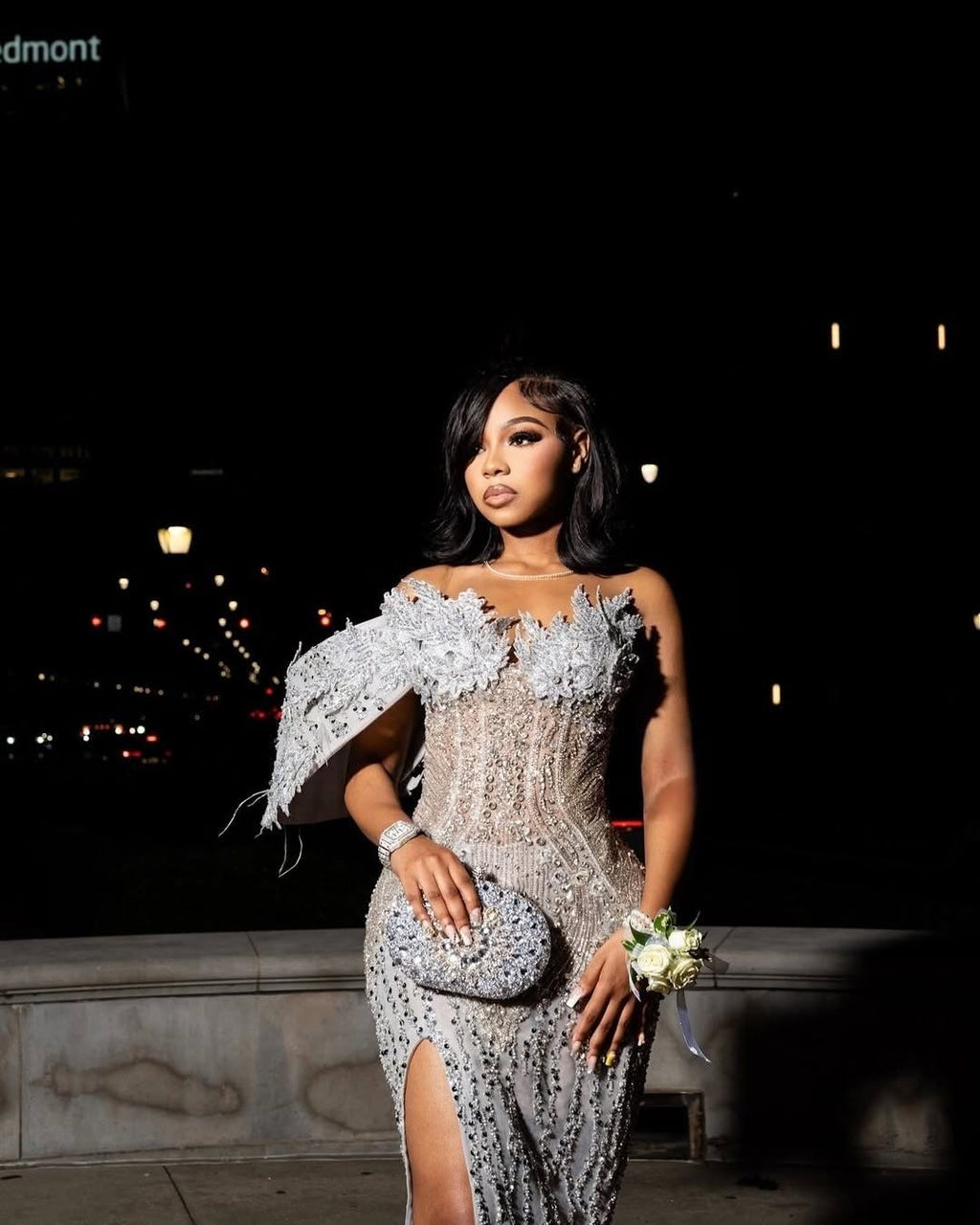 Elevate your prom night with this stunning silver mermaid gown. The asymmetrical one-shoulder neckline creates an elegant, modern silhouette, while the high split adds movement and allure. Intricate beading cascades down the fitted bodice, flowing into a dramatic mermaid skirt that commands attention. The sweeping court train provides timeless sophistication and photo-worthy drama. Crafted from luxurious fabric with meticulous detailing, this dress transforms you into the evening's showstopper.