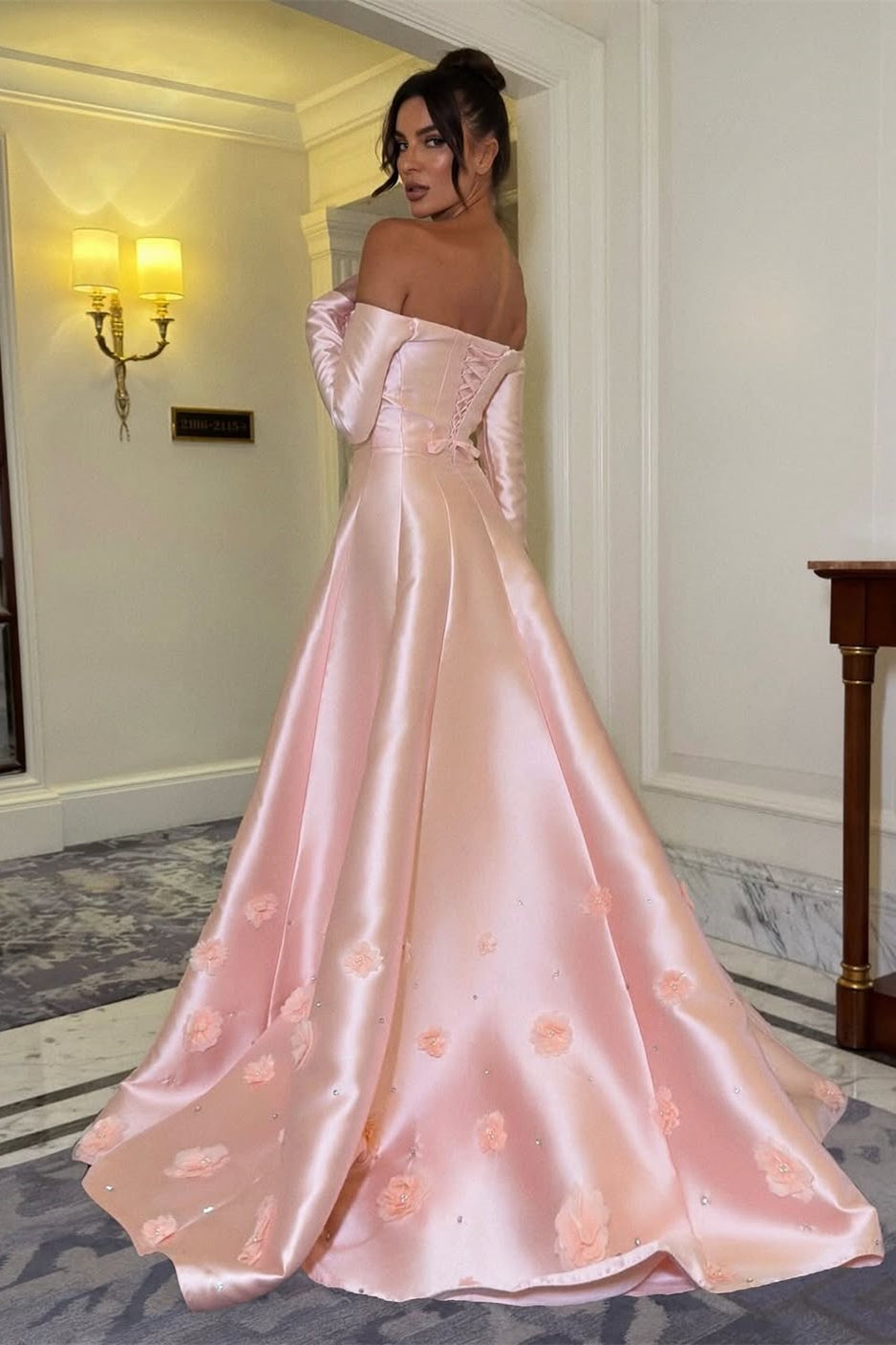 Embrace timeless elegance in this stunning pink prom dress, designed to captivate from every angle. The off-the-shoulder neckline and flowing long sleeves create a romantic silhouette, while luxurious satin drapes beautifully across the A-line skirt. Delicate floral embellishments adorn the bodice, adding couture-inspired detail and dimension. The lace-up back closure provides both visual interest and a custom fit, ensuring you feel confident and poised throughout the evening. Perfect for those seeking a sophisticated, show-stopping look that balances classic charm with modern glamour.