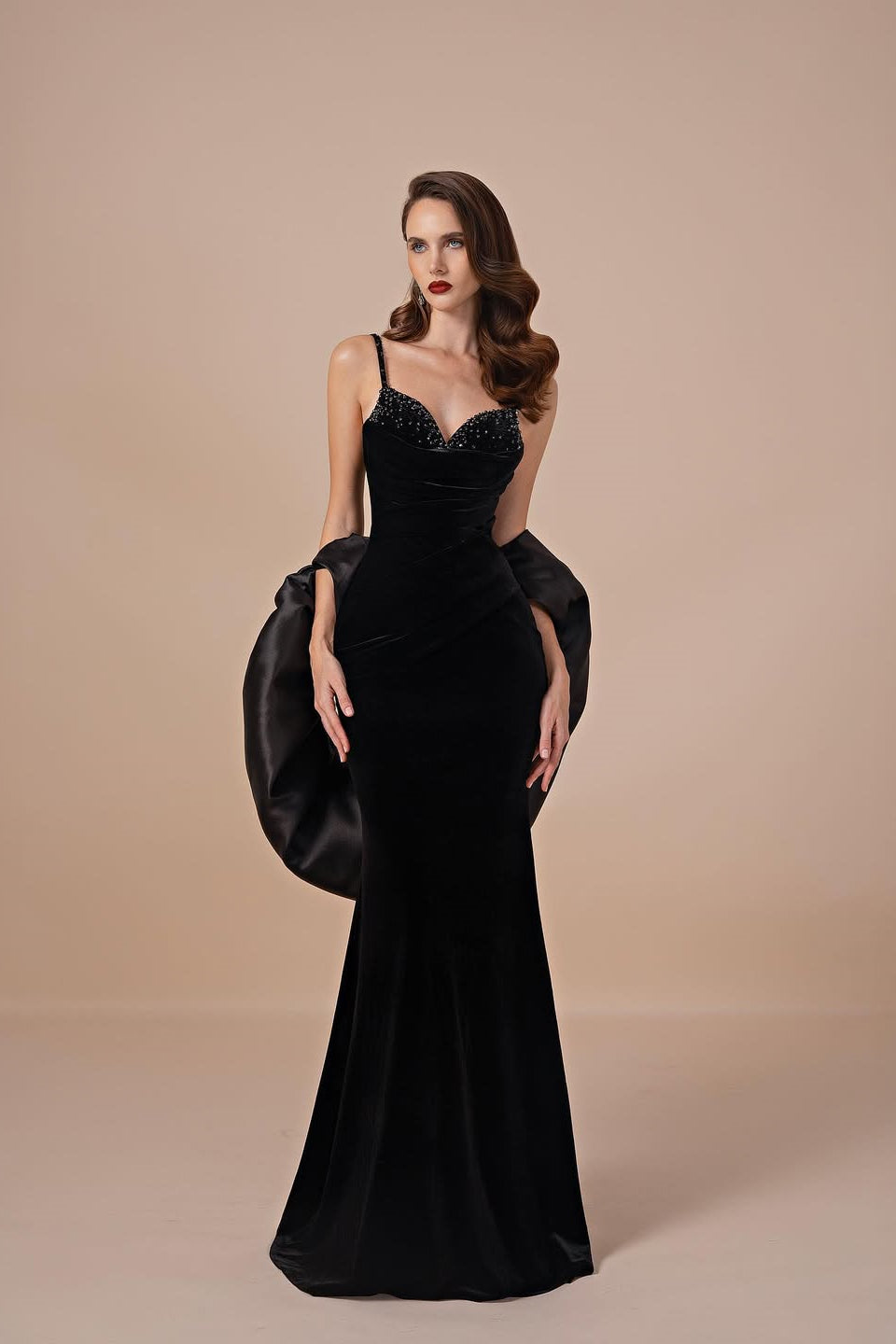 Embrace timeless elegance with this stunning vintage-inspired prom dress. Crafted from luxurious velvet, this sleek black gown features a flattering V-neckline and delicate spaghetti straps that frame the shoulders beautifully. The mermaid silhouette hugs your curves gracefully before flowing into an elegant train, while intricate beading adds glamorous sparkle throughout. A convenient zipper closure ensures a perfect fit. Ideal for prom, formal events, or special occasions where you want to make an unforgettable impression with classic sophistication.