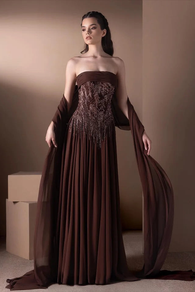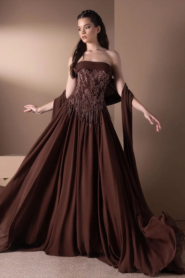Embrace timeless elegance with this stunning vintage-inspired prom dress. Crafted from luxurious chiffon, the strapless silhouette and sleeveless design create a graceful, sophisticated look. The flattering A-line cut flows beautifully, while delicate beading adds glamorous detail throughout. The rich dark brown hue exudes classic charm and pairs effortlessly with any complexion. Includes a coordinating shawl for added versatility and warmth. Perfect for prom, formal events, or special occasions where you want to make an unforgettable impression.