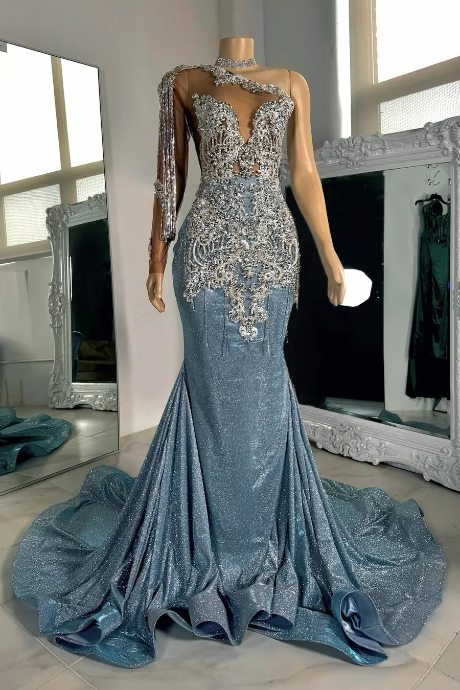 Elevate your look with this luxurious Long sleeves Silver Dusty Blue Shiny Court Train Beaded Prom Dresss. The shimmering silver and dusty blue hues are accentuated by delicate beading and a flowing court train. The long sleeves add a touch of elegance, making this the perfect dress for any formal occasion.