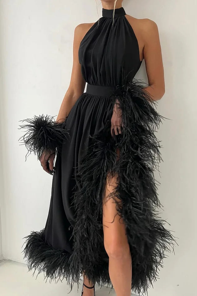 Charming Black Halter Chiffon Prom Dress A-Line Feather With Gloves Zipper