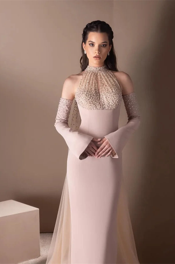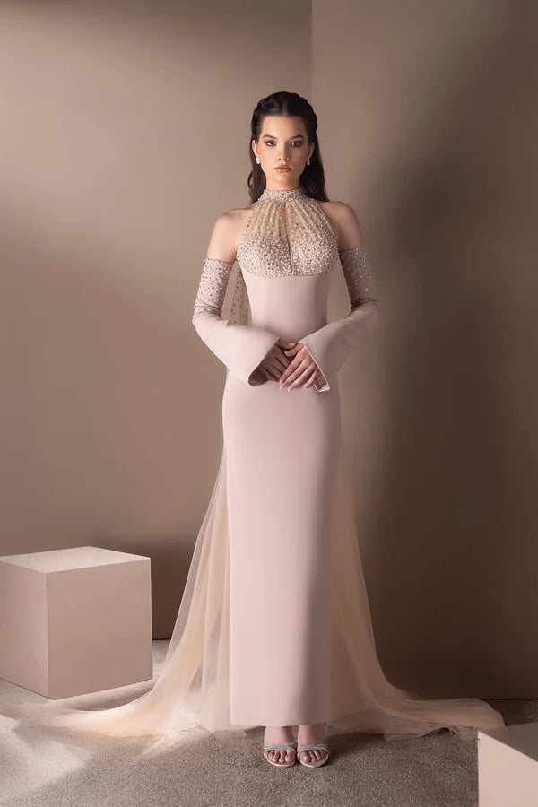 Elevate your prom night with this stunning mermaid silhouette gown crafted from luxurious satin. The halter neckline creates a graceful, flattering frame, while intricate beading adorns the bodice for timeless elegance. Detachable sleeves offer versatile styling options—wear them for a classic look or remove them for a sleek, modern aesthetic. Delicate ruffle details cascade down the skirt, adding movement and dimension to your ensemble. Perfect for those seeking a show-stopping statement piece that combines sophistication with contemporary flair.