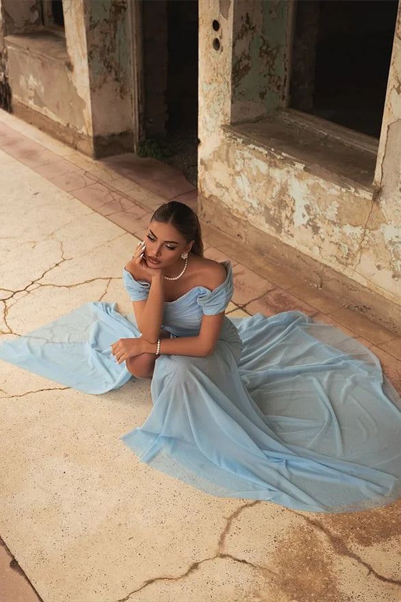 Elevate your prom night with this stunning sky blue chiffon gown. The elegant off-the-shoulder neckline frames your silhouette beautifully, while the flowing A-line skirt creates graceful movement with every step. Delicate ruffle pleats add dimension and texture throughout, and the high split offers a modern, daring touch. Crafted from luxurious chiffon, this dress drapes effortlessly for a refined, sophisticated look that captures attention without compromising elegance. Perfect for making an unforgettable entrance.