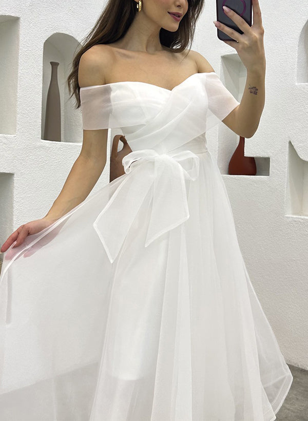 Off-The-Shoulder Tea-Length Tulle Wedding Dresses Bows