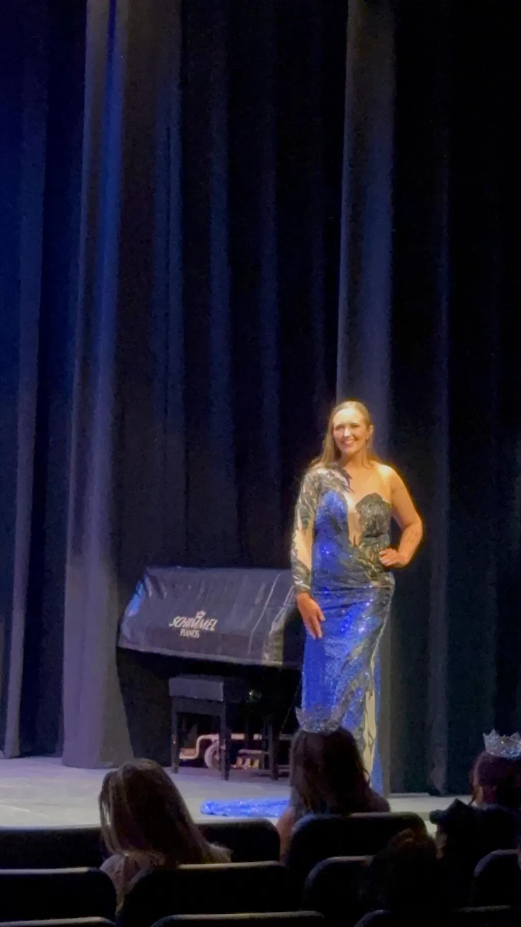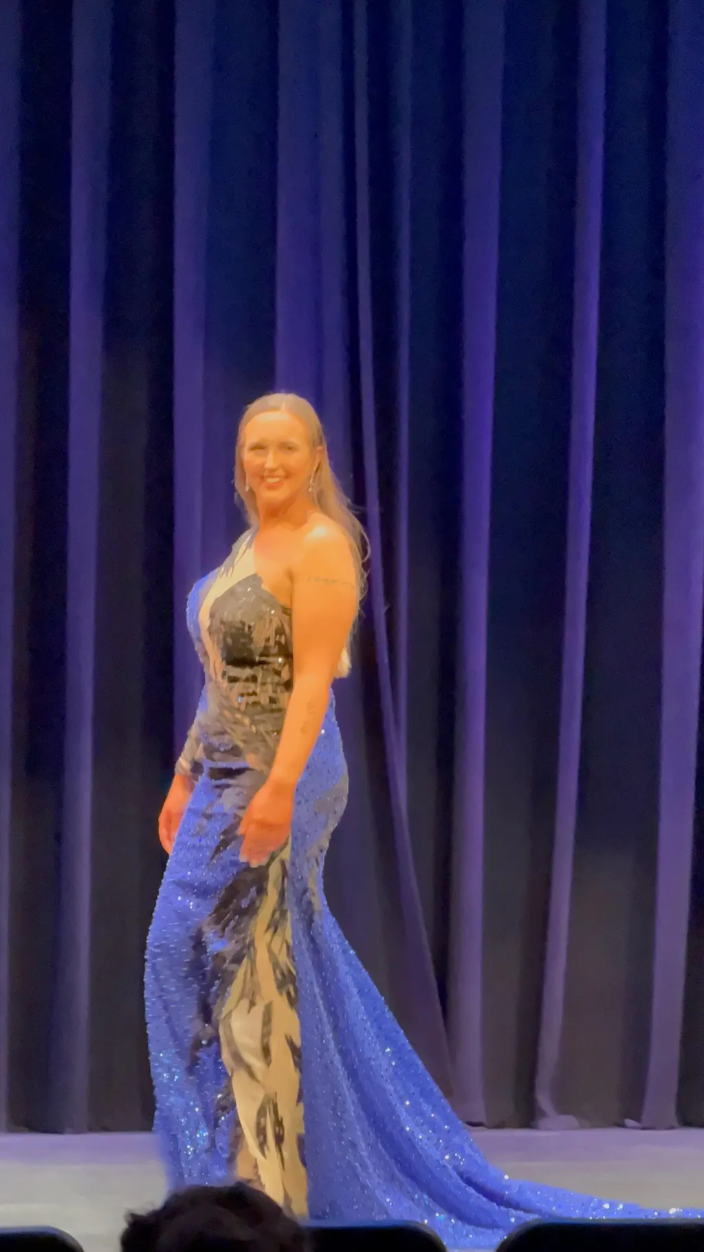 I love this dress! I got the custom size selection and it fit me like a glove! I wore it to Regionals for a pageant and it looked stunning on stage! I changed the main color to a royal blue to enhance my eyes!