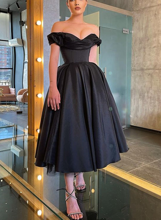 A-Line Off-The-Shoulder Satin Black Homecoming Dresses With Tea-Length