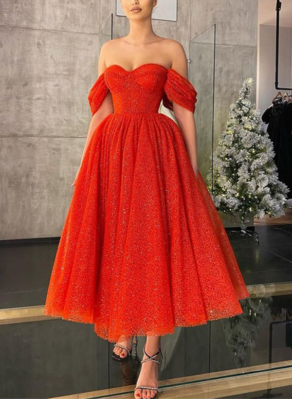 A-Line Off-The-Shoulder Sleeveless Tea-Length Homecoming Dresses