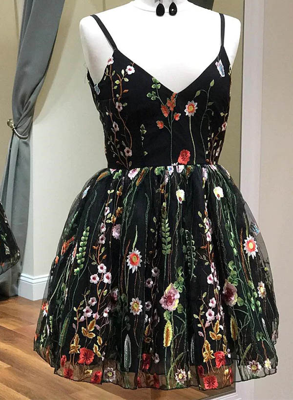 A-Line V-Neck Short/Mini Lace/Tulle Homecoming Dresses With Flower(s)