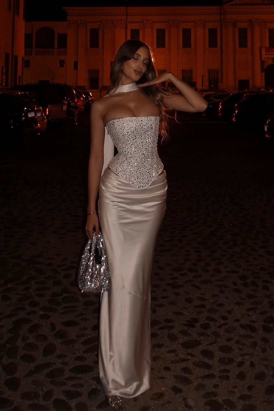 Elevate your evening with this exquisite strapless satin prom dress, designed to flatter every curve in a mermaid silhouette. The sleeveless style and smooth satin fabric create a sleek, sophisticated look, while the gem detailing adds a touch of refined sparkle. The lace-up back ensures a perfect fit, combining elegance with comfort for an unforgettable night.