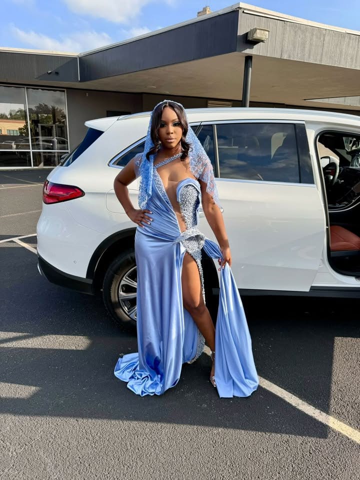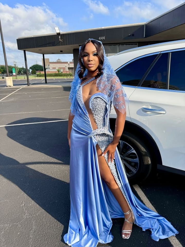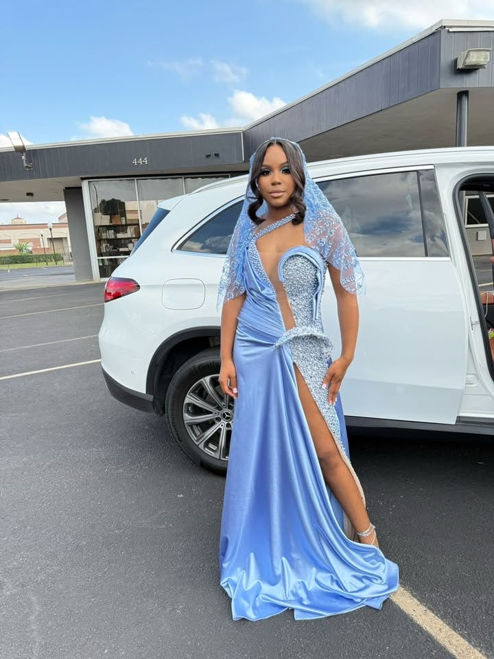 Dusty Blue One shoulder High Split Beaded Long Prom Dresses