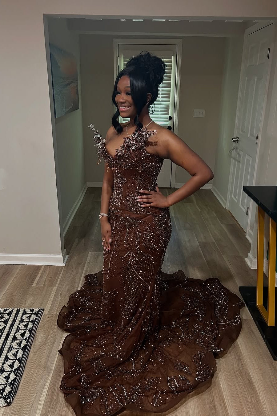 Elevate your evening with this Brown Mermaid Court Train Prom Dress, featuring a flattering V-neck and sleeveless design that highlights your silhouette. The mermaid cut gently hugs your curves, flowing into a graceful court train for timeless elegance. Perfect for formal occasions, this dress combines classic style with a sophisticated touch, ensuring you make a memorable statement.