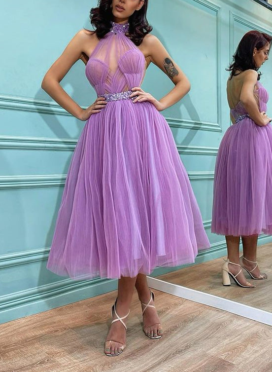 Halter Beading A-Line Tulle Homecoming Dresses With Open Back