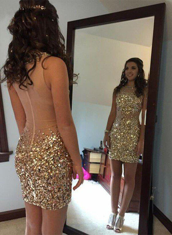 Sheath/Column Scoop Neck Tulle Sleeveless Sequined Short/Mini Homecoming Dresses With Beading Sequins