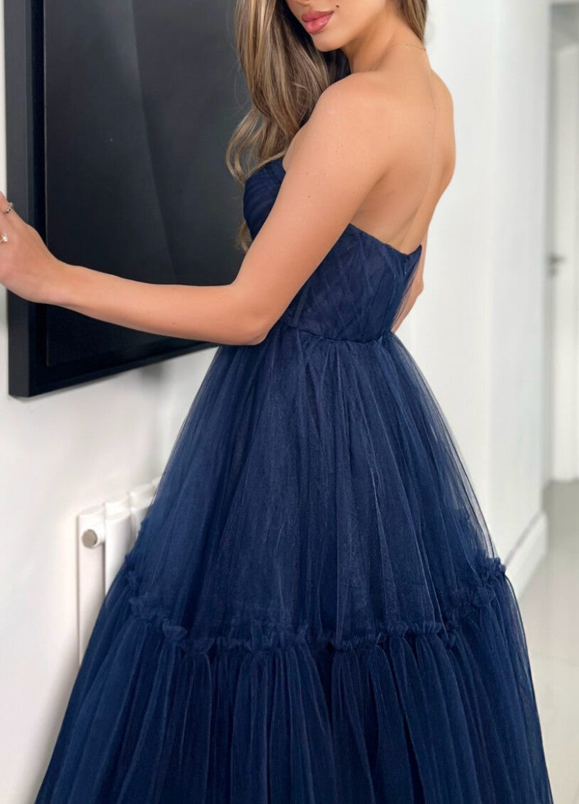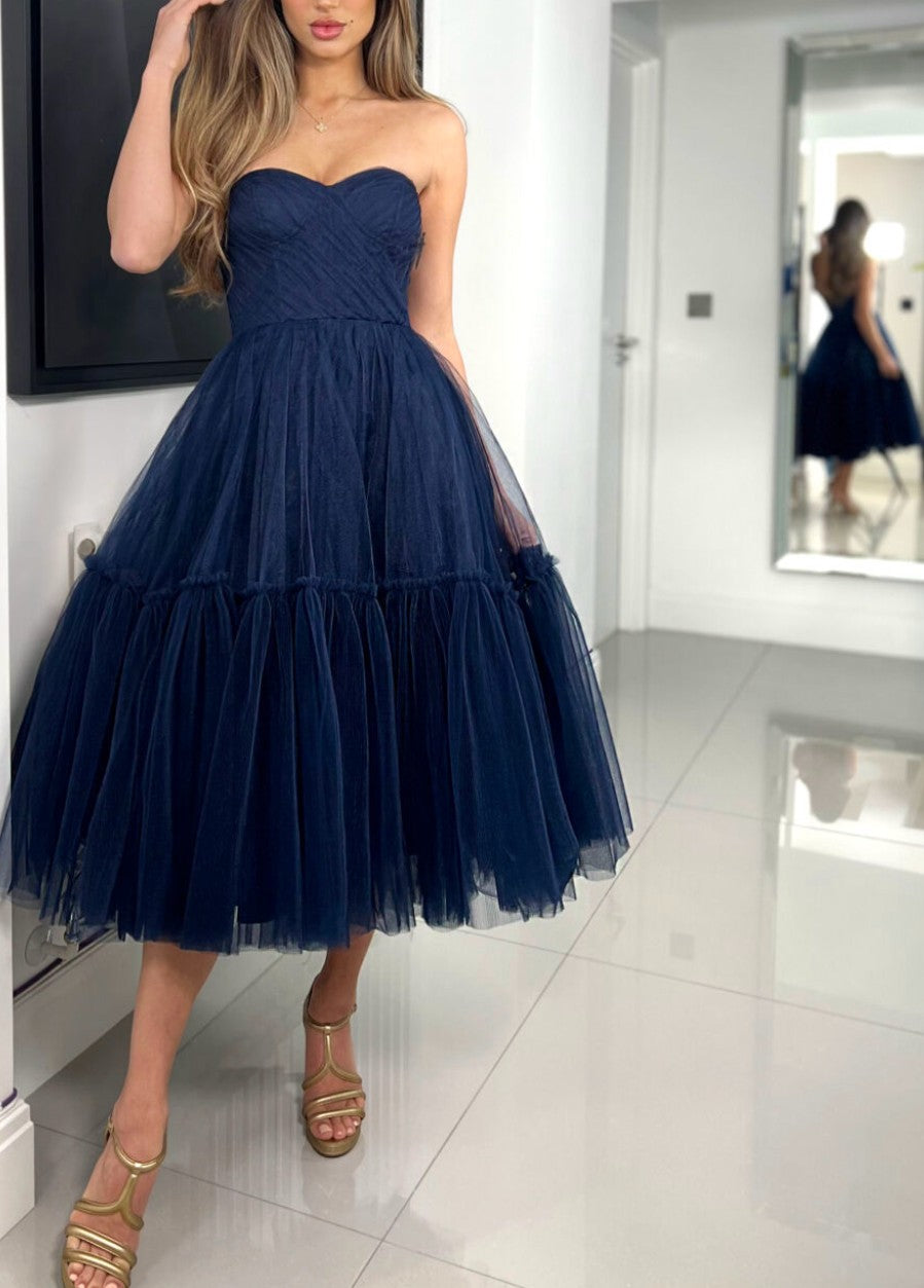 Strapless Tulle A-Line Tea-Length Blue Homecoming Dresses